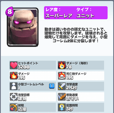 ゴーレムは地上ユニットで最高峰のHPを誇ります。コストは8とデカイですが、安定した強さがあります。更に死亡しても死亡ダメージと小型のゴーレムを発生させる能力があるので、敵からするとやっかいなユニットです。レジェンドアリーナでも人気のカードで初心者〜上級者まで使えるカードです。 ゴーレムを使ったおすすめデッキ