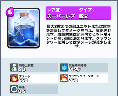 ライトニングも呪文はとても強力でHPがそこそこのユニットであれば、瞬殺ができます。さらに貴重な気絶効果をあたえるカードで、インフェルノタワーなどの攻撃もキャンセルすることができます。呪文の選択はデッキによって変えていきますが、ライトニングのレベルが低いと選択肢から外れ結果的にあまり選択肢のないデッキになりがちなので、呪文は早めにレベルをあげて選択肢を増やしましょう。 ライトニングを使ったおすすめデッキ