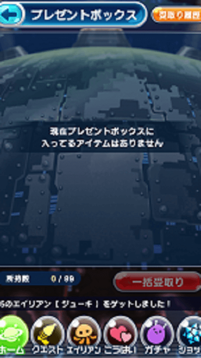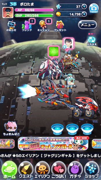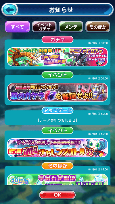 エイリアンのたまごのお知らせが表示されます。「ガチャ、イベント、アップデート」等など、ここを見れば大体の事は知る事が出来ますね。