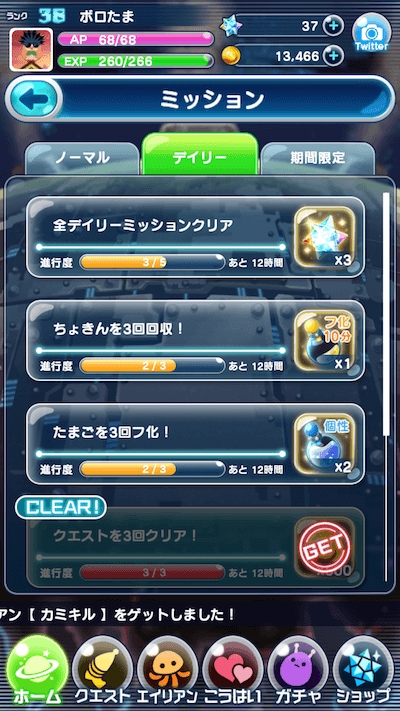 クエストなどで条件を満たすと、宇宙石やゴールドなどの報酬が受け取る事が出来ます。デイリーミッションは毎日やっておきましょう。