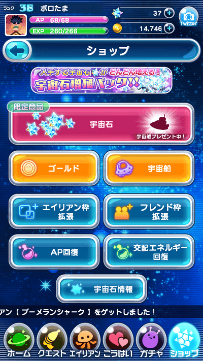 「宇宙石やゴールドや宇宙船の購入」や、「エイリアン、フレンドの枠の拡張」や、「AP(スタミナ)、交配エネルギー回復(最大3)」が行えます。