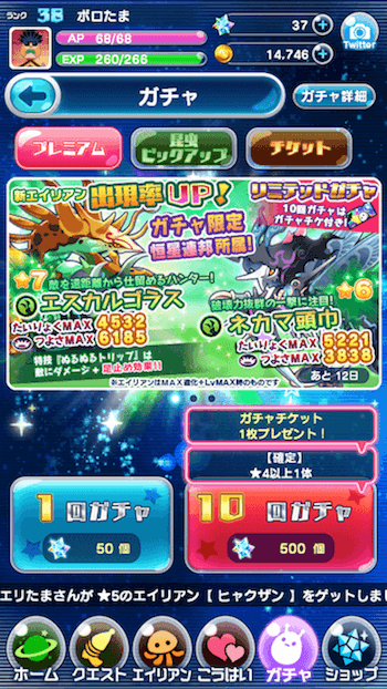 宇宙石やガチャチケットを使用し、☆3以上のエイリアンを手に入れる事が出来ます。定期的に限定エイリアンが実装されるので、引くタイミングには気を付けましょう。