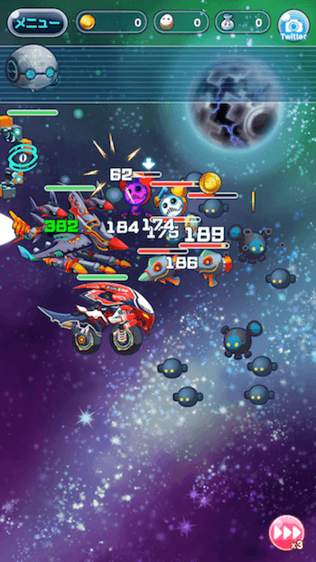 エイリアンのたまごは「オートバトル」となっており、「1倍、2倍、3倍」とバトルスピードを上げる事が出来ます。スキルの発動や攻撃タイミングもお任せなので、事前のパーティ編成やレベル上げが大事になって来ますね。クエストでは、「ゴールド、経験値、アイテム、宇宙石、エイリアン」が手に入ります。