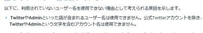 画像にも有る通りに、「Twitter、Admin」と言った語が含まれているユーザー名は使用できません。