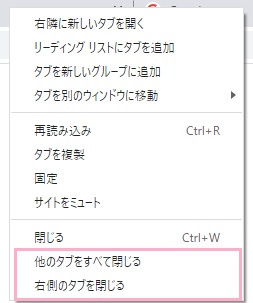 PCブラウザ版Google Chromeでは、すべてのタブを閉じるとウィンドウも閉じてアプリケーションが終了されてしまいます。ですので、最低一つはタブが残るようになっています。ですが、指定したタブ以外のタブを閉じたり表示しているタブの右側にある残りのタブをすべて閉じるといったことは可能です。