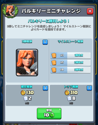 最近のイベントと同じマイルストーン報酬となります。1勝、2勝、3勝ごとに報酬をゲットすることができます。トップ報酬は ・310ゴールド ・カード8枚となっています。 ミニチャレンジなので3勝というところがかわいいですねw