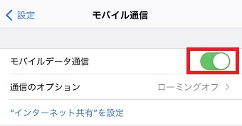 次に試してもらいたいのがモバイルデータ通信を一旦オフにし、その後オンにするという対処法です。モバイルデータ通信をオフにする方法は下記の通りです。