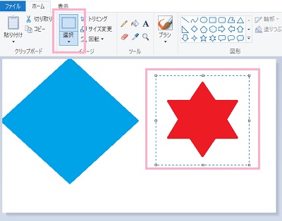 画像編集でよくありがちなのが、画像に画像を重ねて一つの画像を作成するケースです。図形Aに図形Bを重ねる・写真にスタンプとして他の画像を重ねるといったことを行おうとしても、ペイントだと範囲指定が細かく行えないため重ねたい画像だけを指定するといったことが行えずキャンバスの不要なところまで選択してしまうことになります。上記画像のように、図形Aに図形Bを重ねようとしたら図形Bの背景色である白色まで選択した状態になってしまい、図形を思ったように重ねられない…という経験をしたことはありませんか?