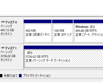 Windows10のパソコンのストレージの中を見てみると、「OEMパーティション(回復パーティション)」という領域が作成されていて気になったことはありませんか?画像の例だと、450Mほどの謎の領域が作成されていますよね。OEMパーティションとは、かっこ書きの通り回復パーティションのことを指します。Windowsのリカバリが必要になったときに使われる、工場出荷時の設定に復元するためのデータがこのパーティションの中身として詰まっています。そのため基本的には予約済みの領域となるため操作することはできません。