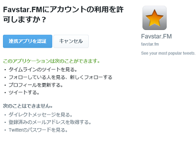 Twitterとファボスターを連携します。場合によっては、Twitterの「IDとパスワード」を入力する必要も有りますね。