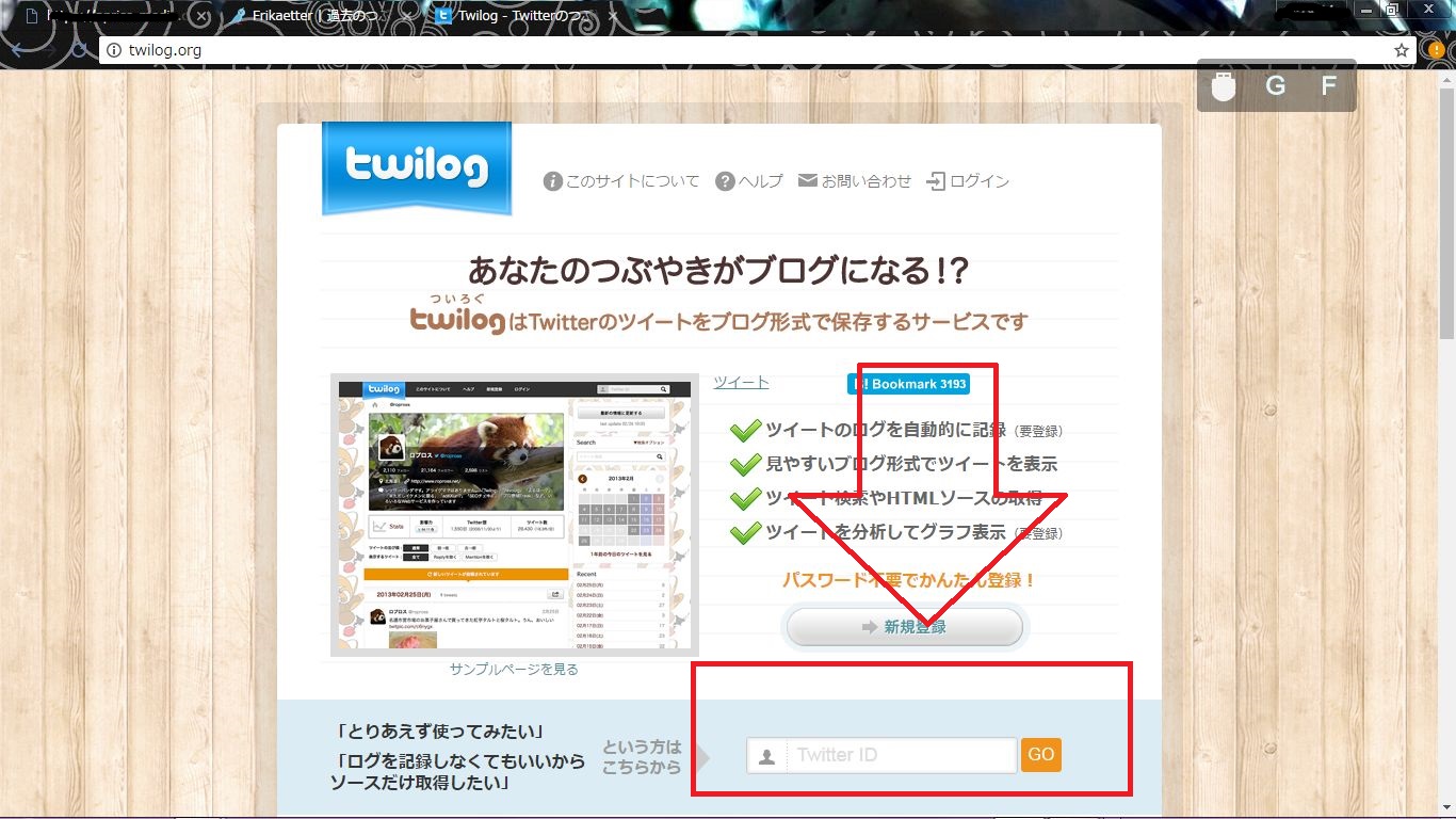 ① twilogページ内の中段あたりにあるうす水色の背景の検索欄に自分の調べたいユーザーのIDを入力(@〇〇の場合@を除いて〇〇だけを入力)⇒「GO」をクリック