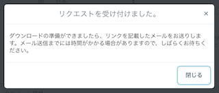 リクエストが完了するとこのようなポップアップが表示されます。全ツイート履歴のダウンロード用のURLがツイッターに登録されているメールアドレス宛に来ますのでメールを確認しましょう。