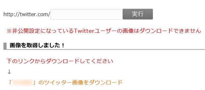 画像の取得が完了していると、このような文字が表示されます。 「○○」のTwitter画像をダウンロードを押すと、PCのダウンロードフォルダに保存されます。