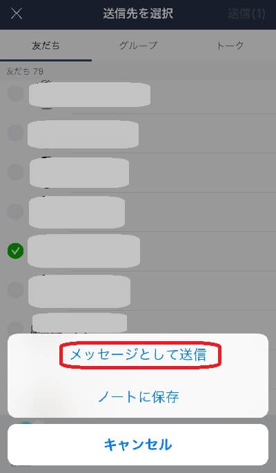 右上の送信をタップするとメッセージかノートか選択しますが、今回はメッセージを選択しましょう。