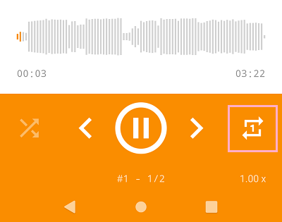 Androidスマホアプリ版AIMPでは、再生画面の右側に表示されているリピートボタンを押すたびに「プレイリストリピート」・「単曲リピート」・「リピートなし」が切り替わります。区間リピートなどは行えないので注意しましょう。
