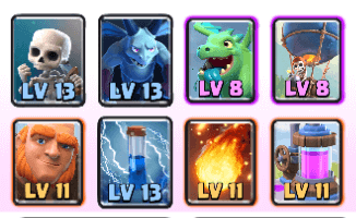 ジャイアントの背後から「ガーゴイル」「ベビードラゴン」「バルーン」を出していく戦術です。ジャイアントは盾として優秀ですが、体が大きいせいか後ろに続くユニットが地上の場合はうまくジャイアントを追い越して進めない場合があります。 その点空ユニットは関係ないので、うまくすすめるのが特徴です。 またジャイアントの天敵はインフェルノタワーやインフェルノドラゴンですが、対策としてザップを入れています。