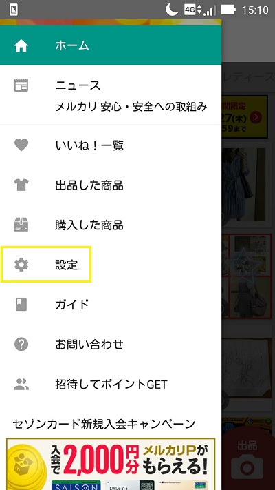 (1)左の「三本の棒」があるところをタップして開きます。 (2)「設定」をタップします。