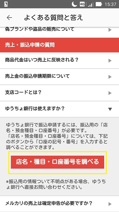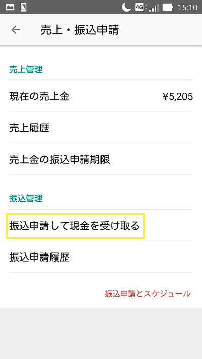 (3)このような画面になるので、「売上・振込申請」をタップします。