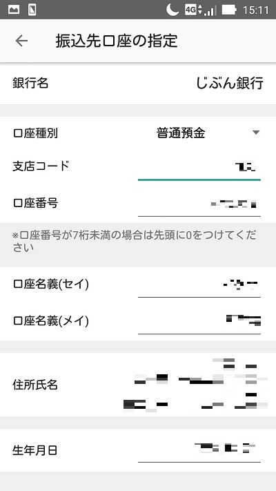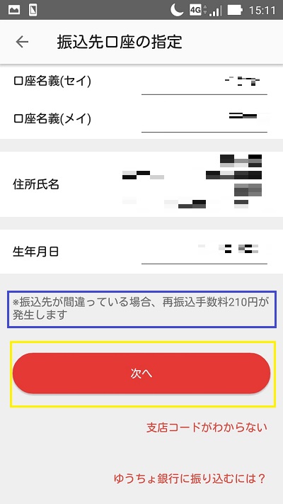 (6)振込先が間違っている場合には、最振込手数料210円が発生してしまうので、 口座情報と自分の情報は何度も確認して、絶対に間違いがない自信があれば 「次へ」をタップします。 (※)支店コードについては、通帳/キャッシュカードに記載してありますので確認しましょう。 (※)また、ゆうちょ銀行に振り込む際には、「ゆうちょ銀行に振り込むには?」をタップしてください。
