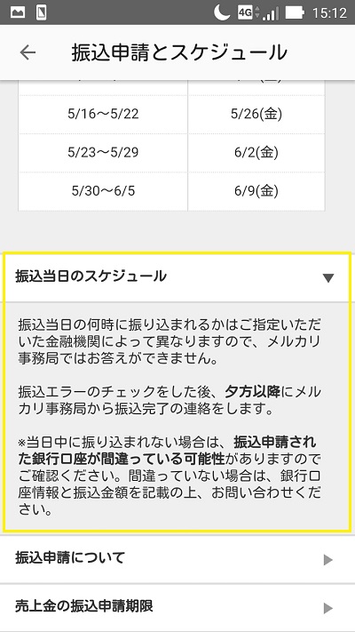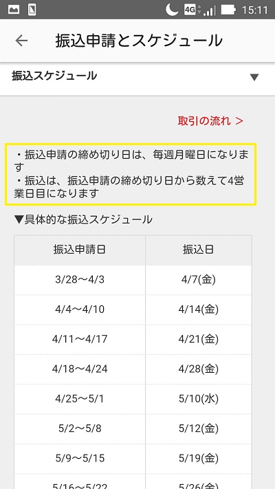 ・振込申請の締切日は、「毎週月曜日」 ・振込日は、振込申請の締め切り日から数えて「4営業日目」 具体的な振込スケジュールが表になっていて見ることができます。