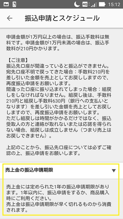 売上金は、1年間の期限があります。 1年以内に振込申請/商品購入に使われないと、消えてしまいます。