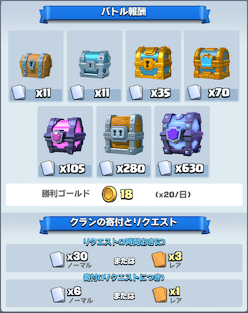 ここまでくると結構なゴールドが勝利報酬で入手できます。 次に寄付とリクエスト数についてです。 リクエスト(7時間おきに): ノーマル30枚、またはレア3枚 寄付(リクエストにつき): ノーマル6枚、またはレア1枚 とアリーナ8とかわらない数となります。