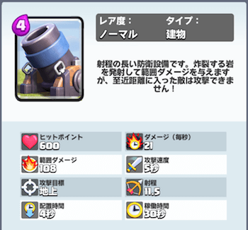 レアリティ: ノーマル タイプ: 建物 攻撃速度: 5秒 攻撃目標: 地上 射程: 11.5 配置時間: 4秒 稼働時間: 30秒 アンロック: アリーナ6 アリーナ6の攻略情報