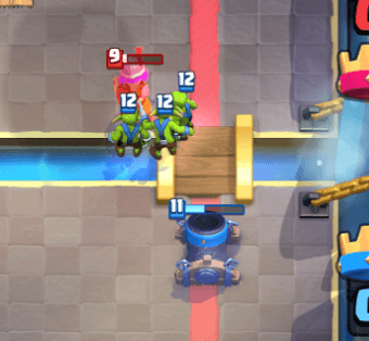 このデッキでの迫撃砲の役割は迫撃砲で相手タワーを狙うところにもありますが、敵の攻撃を迫撃砲に集める役割もあります。同じくクロスボウも敵のタワーを狙える施設ですが、迫撃砲はクロスボウよりは低コストで設置できるので敵の攻撃を引き付ける囮という役割も担えます。 敵の攻撃が迫撃砲に集中しているうちに「ディガー+ゴブリン」で反対サイドから攻撃をするのも有効です。