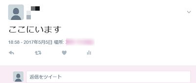 位置情報の共有が出来ると、「日時、日付、場所」の3つが表示されます。とは言っても、「どこどこの○○」に居ると言う事が表示される訳でも無く、「○○県○市」みたいな大雑把な表示になっています。 ツイート内に、「○○と言う店に居ます」と書いてしまうと、「○○市の○○と言う店は・・・」と検索されてしまうので、特定もされてしまいます。
