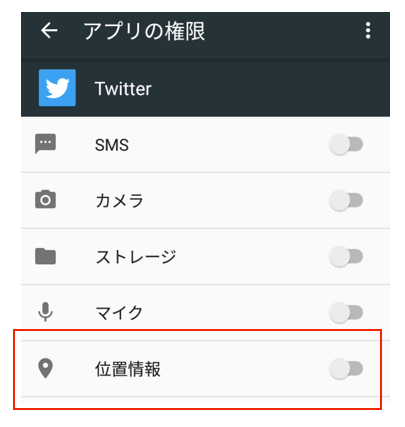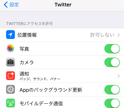 [許可]をタップすると、Twitterのアプリで許可されているスマホの機能が表示されます。 その中の[位置情報]を無効にすることで、Twitterでの位置情報の共有は無効になります。