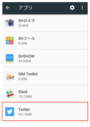 [設定]を開き[端末]→[アプリ]と進みましょう。インストールされているアプリが表示されますので、その中のTwitterを選択しましょう。
