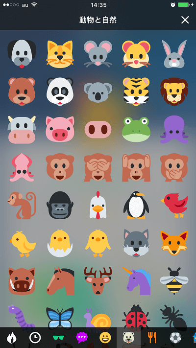 このように、タブを選択する事で、「動物・季節・スポーツ」等などのステッカーを使えます。