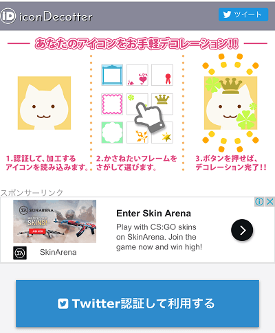 上記のリンクから「デコッター」にアクセスし、「Twitter認証して利用する」を選択しましょう。