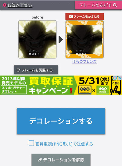 先ほど選択した「けものフレンズ」のフレームが反映されていますので、後は画像の調整などを行っておきましょう。