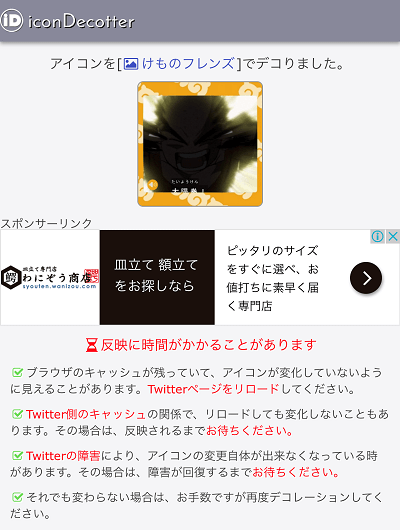 この画面になったら、デコったアイコンがTwitterに反映されています。Twitterのアイコンを確認し、上手く反映されていれば成功です。