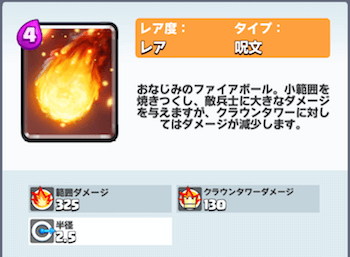 クラロワの「ファイアボール」のカードはクラロワで最初から入手可能な呪文のレアカードです。