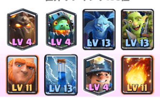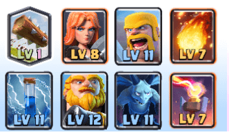 HPの高いユニットには「インフェルノタワー」大群系のカードには「ローリングウッド」「ザップ」「ファイアボール」という形で防御ができるデッキです。