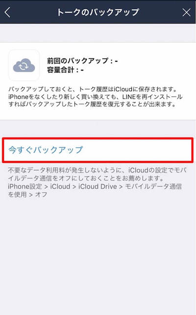 2)[トークのバックアップ]>[今すぐバックアップ]をタップ また、iCloud上にバックアップされたトーク履歴は新しい端末で復元することができます。