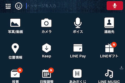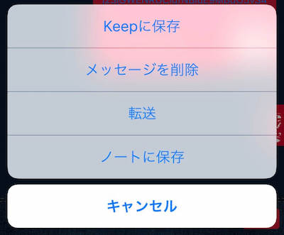 LINEのトーク画面から受け取ったテキストメッセージ音声メッセージ、写真、動画などをKEEPで保存するには(キープするという)、トーク画面上の保存したいものを長押しすると