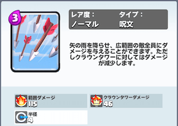 クラロワの「矢の雨」のカードは最初から入手可能な呪文のカードで、特徴としては ・広範囲攻撃 ・ダメージはそこそこ(ザップよりは高いがファイアーボールよりは低い) といった特徴を持つ呪文です。ザップのように停止効果など特殊効果はないですが、その広範囲とザップよりもダメージ量が多くザップで倒せないユニット(プリンセス、ガーゴイルなど)も倒せる威力となっています。
