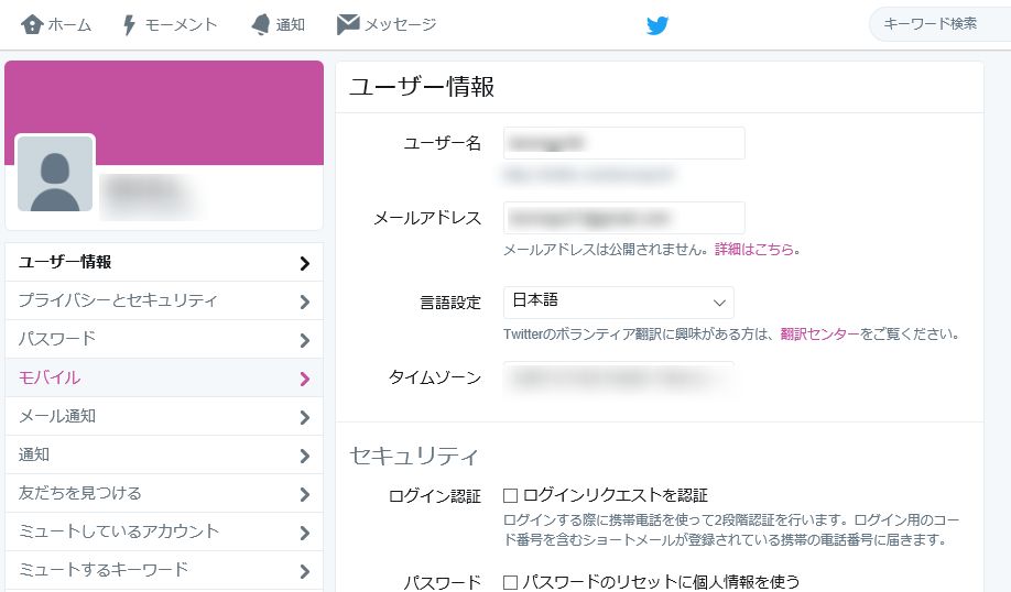 ユーザー情報の画面が出て来るので、下の「モバイル」を押しましょう!