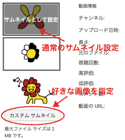これらとは異なる別の画像などをサムネイルとして、指定することもしくはその機能のことをカスタムサムネイルと言います。 この機能は、動画をアップロードする側にならなければ、あまり触れることのない機能となります。