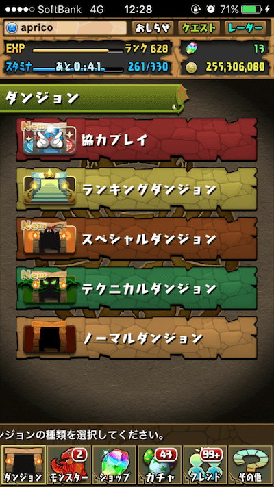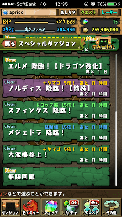 始めは「ノーマルダンジョン」でパズルに慣れたり、ランクを上げたりしていきます。ノーマルダンジョンをクリアしていくことで、上記でお伝えしたレアガチャをまわすために必要な魔法石を貯めることができます。クリアしつつ、5つ魔法石が貯まったらレアガチャをまわしてみてください。 ノーマルダンジョンをクリアしていくと、「テクニカルダンジョン」ができるようなります。こちらはノーマルダンジョンと似ているのですが、大きな違いは相手もスキルを使ってくることです。 敵のモンスターが使ってくるスキルには、こちらのキャラクターを動けなくしてきたり、盤面(画面下のドロップが見えている部分)を暗くして見えなくしてきたりなど様々な種類のものがあります。今まで通常攻撃だけだった相手のモンスターがスキルを使ってくるようになるので、その分攻略も難しくなります。