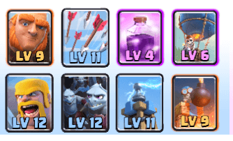 ジャイアントを盾に ・エアバルーン ・ガーゴイルの群れ が後ろから敵に襲いかかるかなり火力メインのデッキとなります。注目してほしいのは ・ジャイアント ・エアバルーン ・バーバリアン ・ガーゴイルの群れ のカードは「スピードが遅い」「集団」のいずれの特徴があり呪文の「レイジ」と相性がいいカードです! 上手くレイジがかかったときの火力は半端ないデッキです!