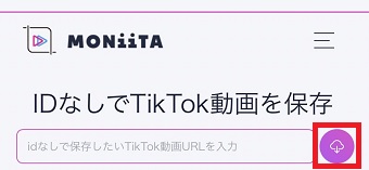 『MONiiTA』が開いたら『idなしで保存したいTikTok動画URLを入力』という部分に先ほどコピーしたURLをペーストします。