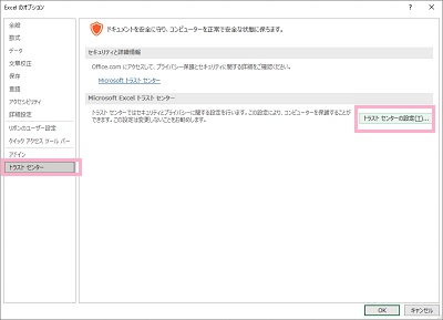 「トラストセンター」ウィンドウが表示されます。左側メニューの「保護ビュー」をクリックして開き、「保護ビュー」項目の3項目のチェックボックスを有効にしてから「OK」をクリックして設定を完了しましょう。