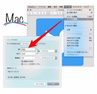 ④メニューの「サイズを調整」を選択し、幅400×高さ400に設定しOKで完了