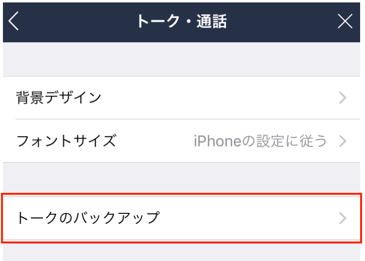トーク・通話のページに「トークのバックアップ」のメニューがありますので、タップしましょう。