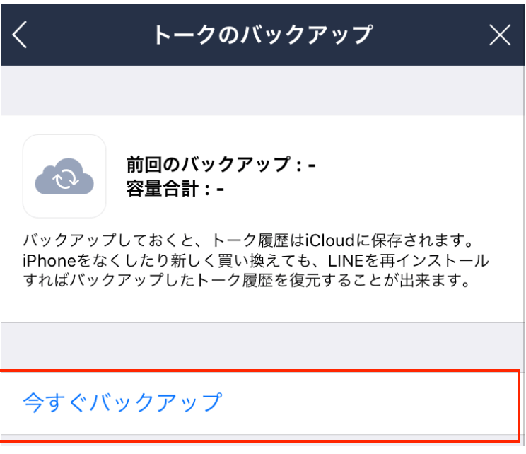 なおiCloudへトーク履歴をバックアップするには通信料がかかりますので、Wifi環境でバックアップは行いましょう! 準備OKでされば、「今すぐバックアップ」をタップして下さい。
