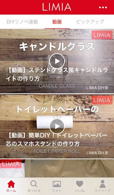 LIMIAの公式アカウントが提供している動画が表示されています。「〜の作り方」といったDIY関係の動画が多く、実際に見本を見ながら作業することができます。
